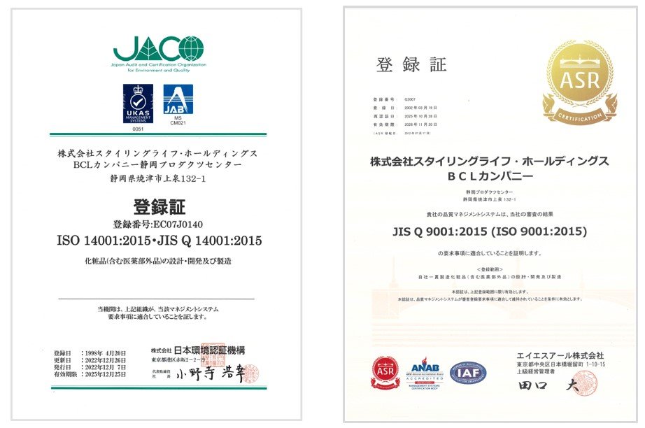静岡プロダクツセンターでは、事業活動が環境に与える影響を把握し、その改善のため、環境保全活動の継続的な改善・向上を図っています。1998年には、化粧品製造工場としていち早く、環境対策への配慮に対する国際規格「ISO-14001」を、続けて2002年には、品質管理および品質保証の国際規格「ISO-9001」を認証取得しています