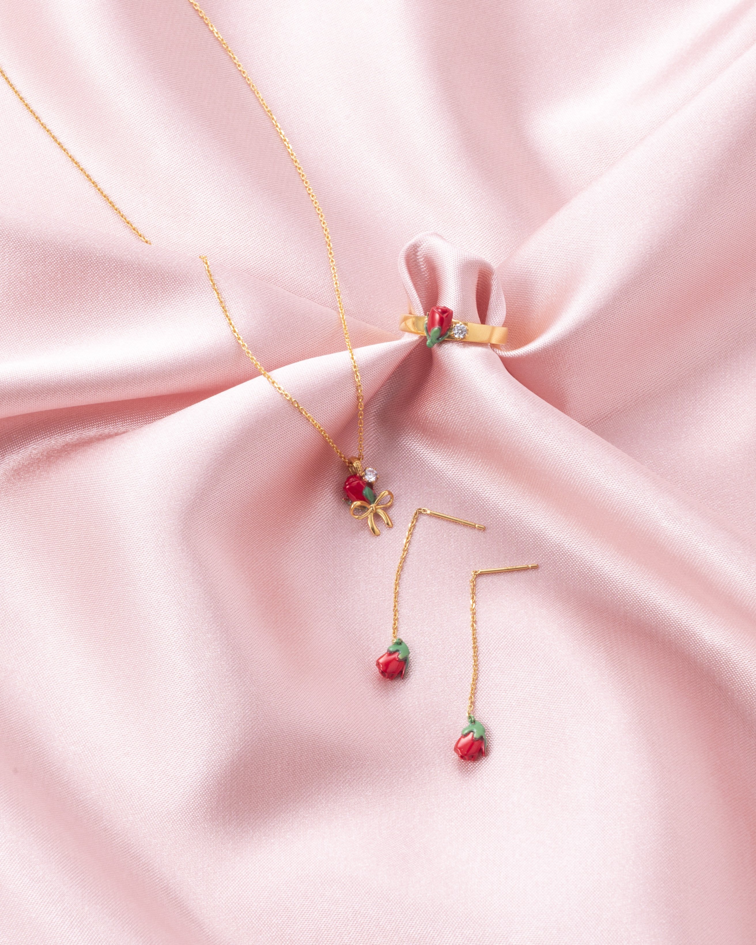 Cath Kidston Japanのアイコンであるローズの蕾をモチーフにしたRibbon Floralのシリーズは、SLV925にK18イエローゴールドのコーティングを素材に用いています。