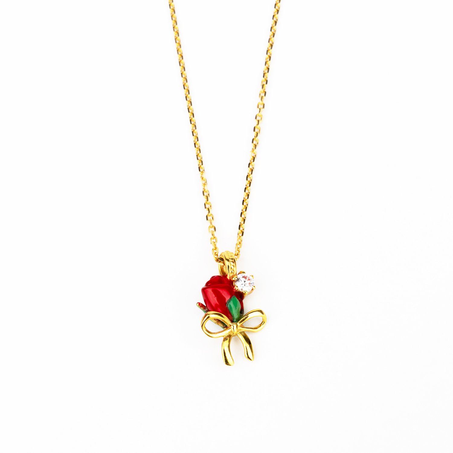 ネックレスには、ローズの蕾のモチーフに加えて、繊細なリボンも職人の手で丁寧に表現。チェーンはパーツ一つ一つにカットが施されており、身に着けると動きに合わせて輝きます。また、石座の裏には、輝きを最大限に引き出すよう光を取り込む穴をデザイン。Cath Kidstonのロゴを刻印したプレートが、さりげないアクセントになっています。