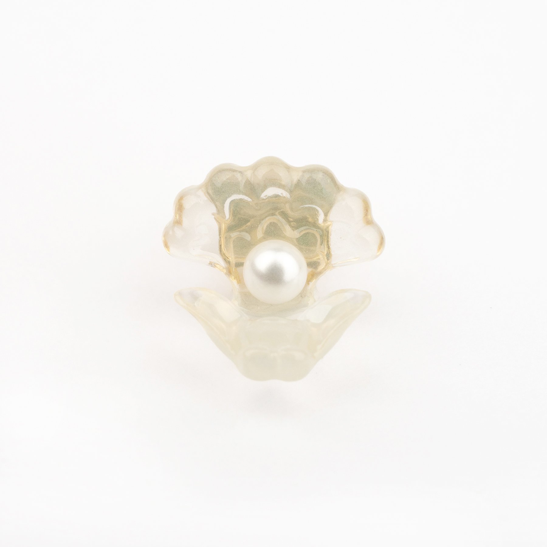 クリアな樹脂の中に極小ラメを閉じ込めることで、光を受けるたびに奥行きのある輝きを楽しめます。手書きのアートを思わせる柔らかく有機的なフォルムの中央にそっと佇むのは、パール。