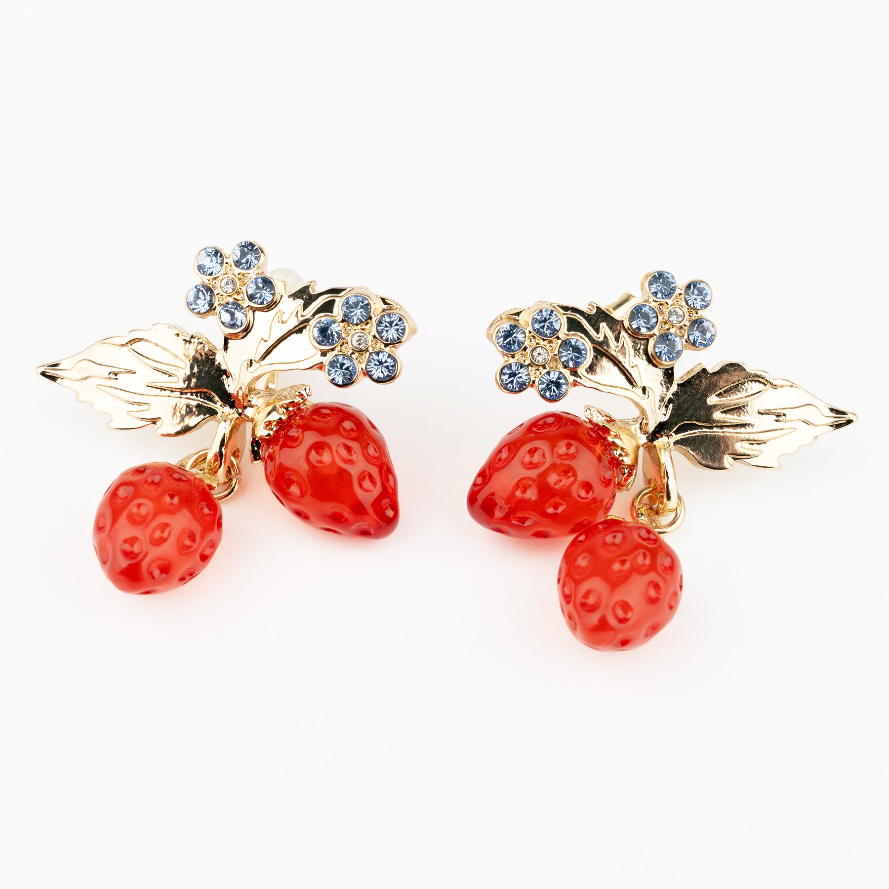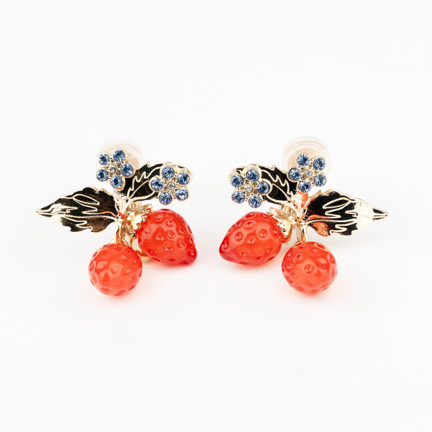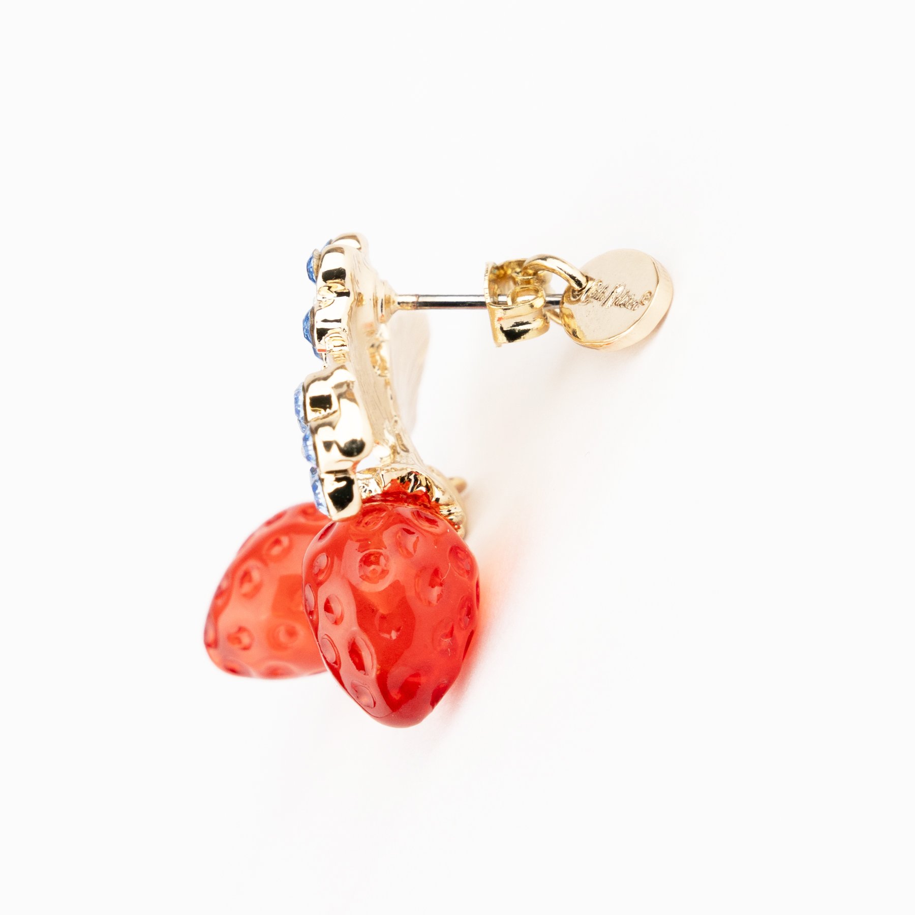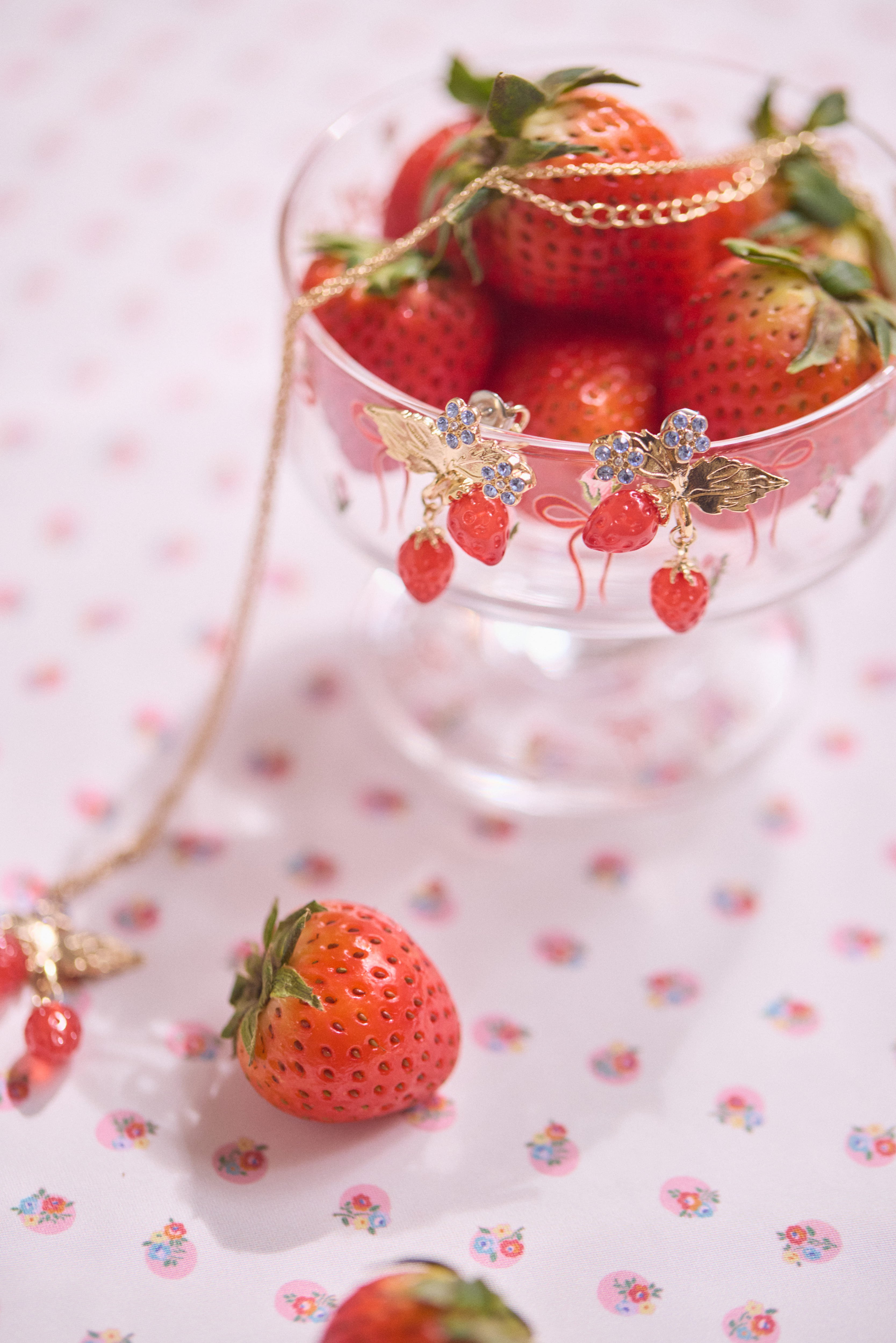 Cath Kidstonを象徴するストロベリーモチーフは、Liquemの得意とする立体樹脂を用いてアクセサリーとして仕上げられ、ピアス、イヤリング、ペンダントとして展開されます。まるでいちごがそのまま飛び出してきたように、つやつやと熟れた真っ赤な2粒が軽やかに揺れ、その上にはライトサファイアのクリスタルで描いた小さなお花がきらりと光ります。身につけるだけでCath Kidstonの世界をお散歩しているような、楽しい気分にしてくれるアイテムです。イヤリングは長時間つけていても痛くなりにくいクリップ式で安定感のあるつけ心地。